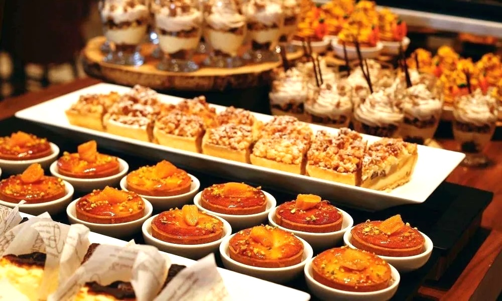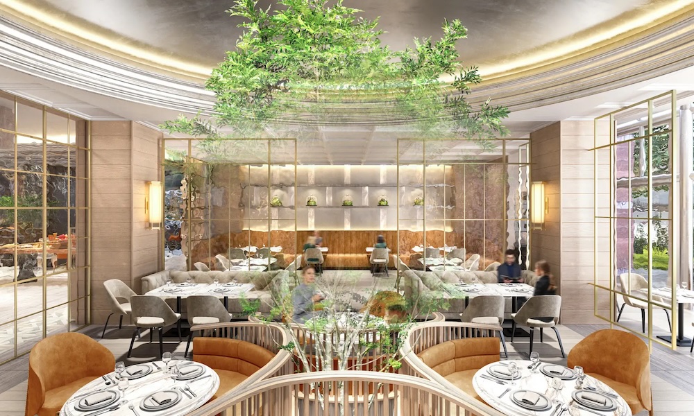 緑豊かな庭園を望む、インターナショナルな活気に満ちたレストラン。
